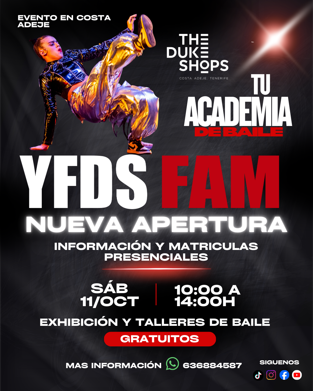 te esperamos en el centro comercial THE DUKE SHOPS conocerás a parte del equipo YFDS FAM SUR y podrás disfrutar de talleres de baile gratuitos, atencion personalizada y asesoramiento para la reserva de tu matricula.